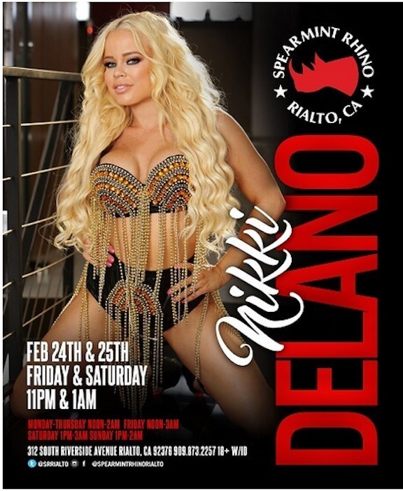 “I’m excited to be dancing for my fans in the San Bernardino area this weekend,” says Nikki Delano. “The patrons at the Rhino clubs are always amazing. Come early for the best seats in the house and stay late so you don’t miss any of the action. Both shows each night will have many surprises!”
