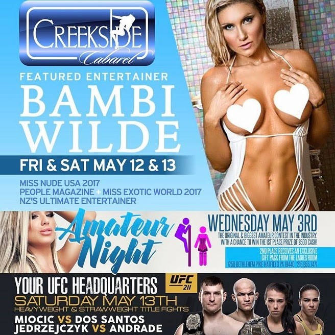 Bambi Wilde will be feature dancing at Creekside Cabaret Gentlemen’s Club in Hatfield, PA on Friday, May 12th, and Saturday May 13th, 2017.