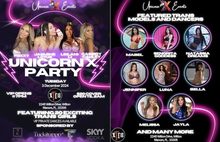 The Unicorn X Party is taking place at Club Xtra located at 2245 Wilton Drive in Wilton Manors, Florida. For pre-sale tickets and more info on the event, visit eventbrite.com/e/unicorn-x-party-tickets-1022837132397?aff=oddtdtcreator. When purchasing tickets, use the code Leilani10.