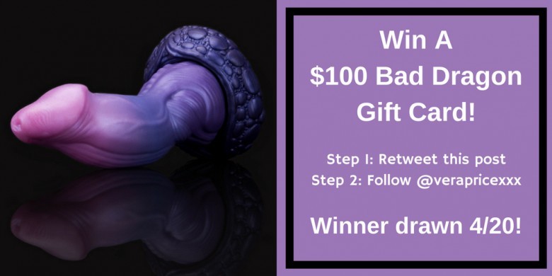 Vera Price is offering an incredible contest—help her build her social media following on Twitter and be rewarded with a $100 gift card from Bad Dragon good for an incredible array of fantasy sex toys and dildos.
