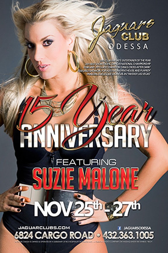Feature Entertainer & Showgirl Suzie Malone will be feature dancing at Jaguars Gentlemen’s Club in Odessa, TX on Friday November 25th and Saturday November 26th, 2016.