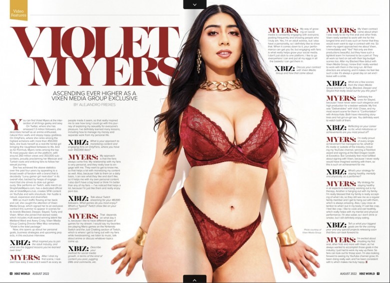 Real-life Hentai girl, influencer, YouTuber, and Vixen Media Group (VMG) exclusive contract star Violet Myers is profiled in the August 2022 issue of XBIZ World in a new must-read article celebrating her Vixen contract and career highlights.