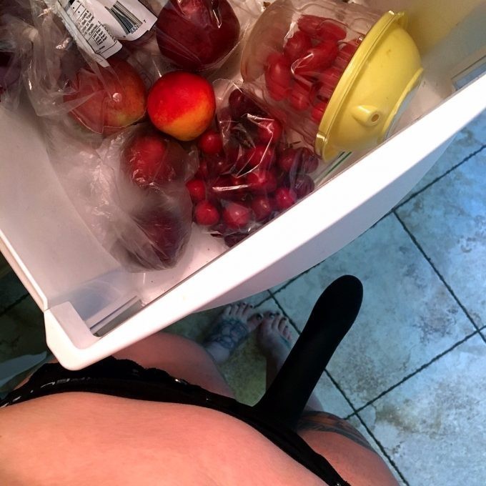 When my new toy arrived, I took super-sexy erotic photos of myself wearing it (see below.) Still, he wasn’t swayed. We kicked around a few ideas and settled on the most rational solution: I would fuck a piece of fruit.